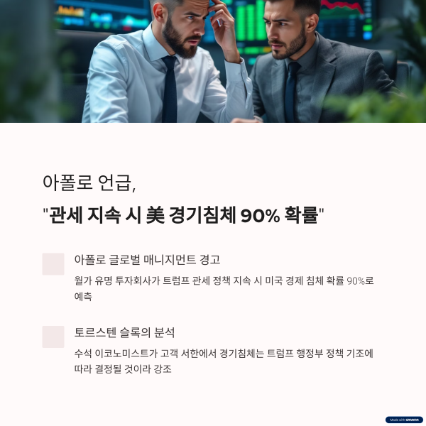월가에서 트럼프 행정부의 관세 정책으로 인한 미국 경기침체 우려가 확산되고 있다. 4월 21일 CNBC 보도에 따르면, 아폴로 글로벌 매니지먼트는 현 관세 정책 지속 시 올해 미국 경제가 90% 확률로 경기침체에 빠질 것으로 전망했다.