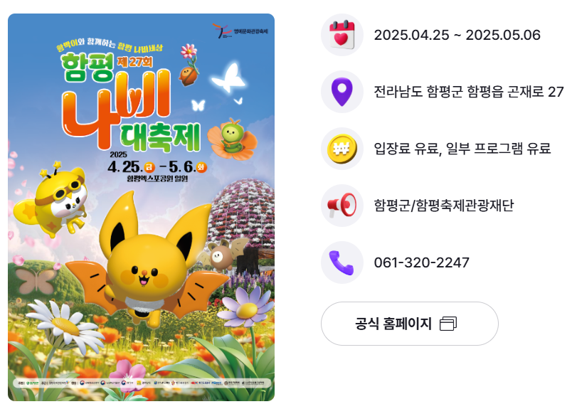 제27회 함평 나비대축제는 단순한 지역 행사에 그치지 않고, 자연과 생명의 가치를 직접 체험하고 나눌 수 있는 특별한 기회로 자리매김하고 있습니다. 아이부터 어른까지 모두가 만족할 수 있는 다양한 프로그램과 세심한 배려가 녹아 있는 구성은 가족 여행지로서 손색이 없습니다. 따뜻한 봄날, 자연을 느끼며 사랑하는 사람들과 소중한 추억을 만들고 싶다면 함평으로 떠나보세요. 이번 축제가 여러분의 봄을 더욱 특별하게 만들어줄 것입니다.